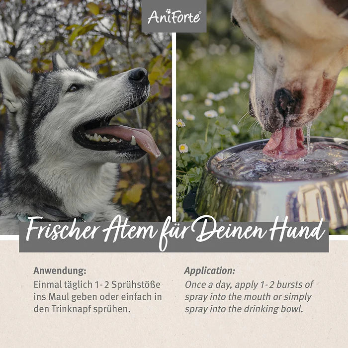 Da wir natürliche Inhaltsstoffe aus Pflanzenextrakten nutzen, eignet sich das Dentalspray für Hunde, die nicht alles vertragen. Das AniForte® Denta Clean & Care Dentalspray ist die flüssige Zahnbürste für Hunde – noch nie war Mundhygiene einfacher! Einmal täglich 1 - 2 Sprühstöße ins Maul oder ins Trinkwasser geben.